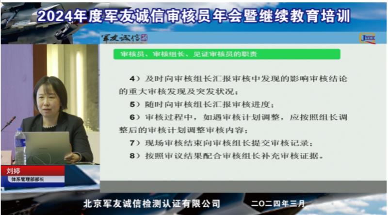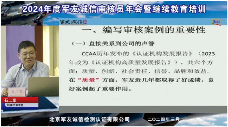 會議邀請到了原國防科工委科技與質量司司長高志強,就國防科技工業發展情況作了介紹。會議還邀請軟件專家陳竹梅老師講授了《計算機軟件質量管理體系審核要點》。為了提升專業技術水平,技術委員會主任兼管理者代表石二奎作《審核案例編制說明》講解,質量保證部部長王淘就《2023年雙隨機一公開檢查工作情況通報》及《審核相關問題》為題作了講解。為了進一步擴大及鞏固市場,信用評價部部長張京燾作靜電防護業務情況介紹,市場部部長喬琦就目前市場形勢及發展情況作了介紹。為了進一步提升人員管理效率,體系管理部部長劉婷宣講了《審核員管理規范及要求》的內容。培訓結束后,組織了線上考試。